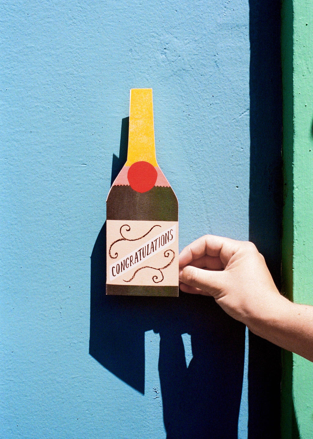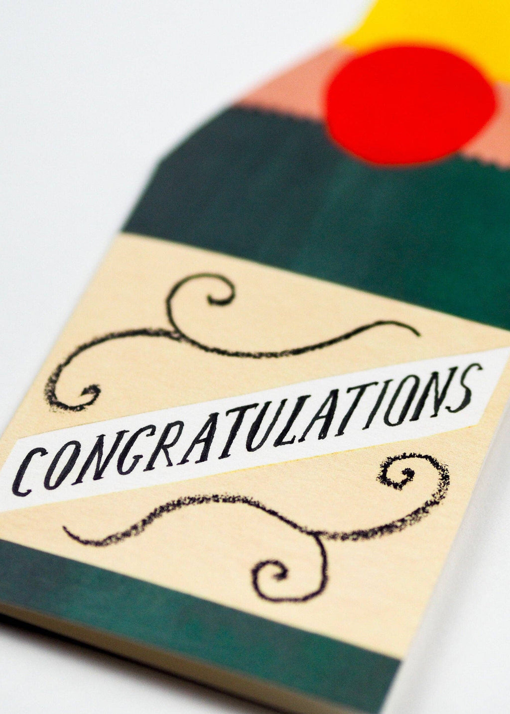 A bottle shaped Champers card! How lovely - the best way to congratulate the happy couple, the newly graduated, someone who got promoted, someone who's broken a world record, someone who's completed their first football sticker book - the list is literally endless. Printed on high quality 300gsm card. Each card measures 7.5cm x 21cm when folded and comes in a handsome ivory coloured envelope, the inside is left blank for your own message.