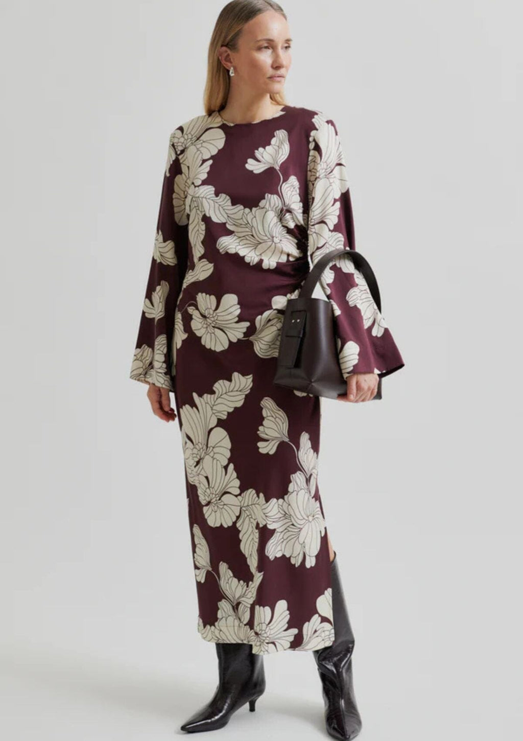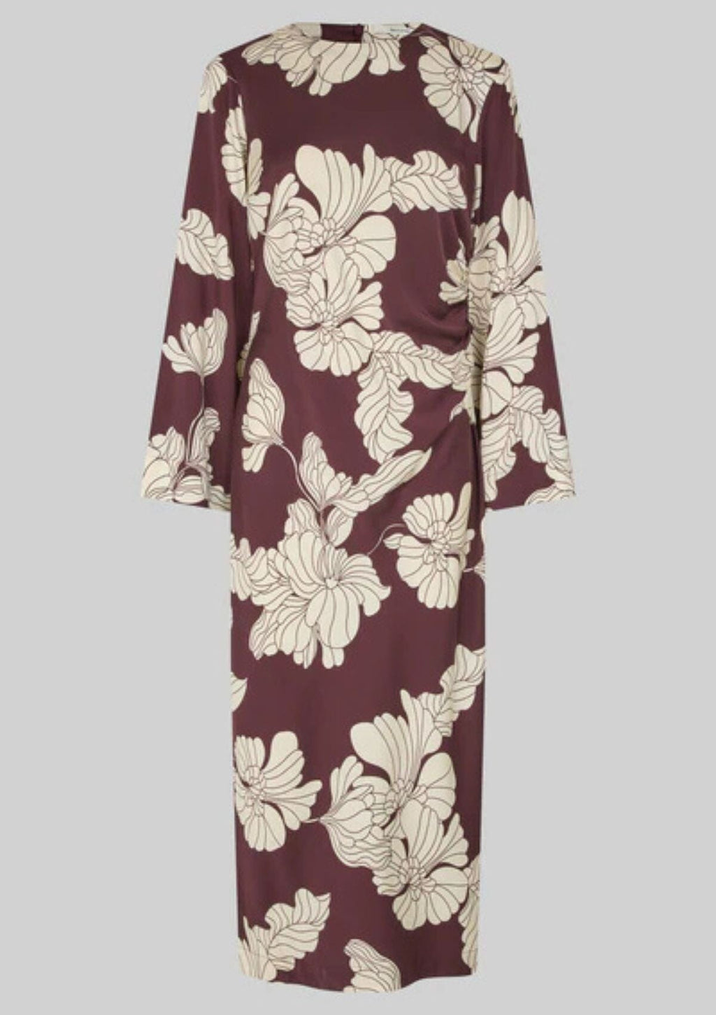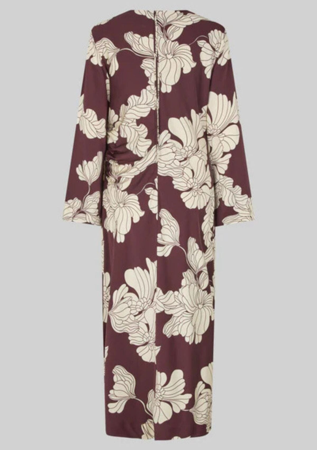 Second Female dress with floral print. The dress is made in a soft and drapy viscose blend with all-over floral print. Featuring a round neckline and concealed zip fastening at the back with long fabric pullers. Padded shoulders and long sleeves. Gathered seam at one side that creates flattering draped effect. Deep slit at one side. Slim fit.
