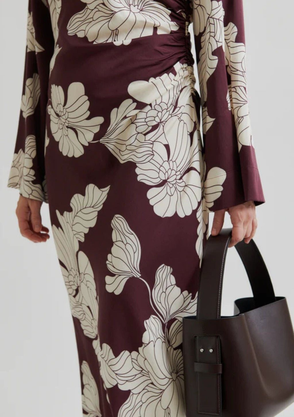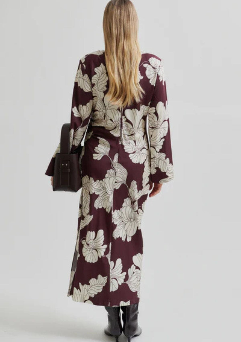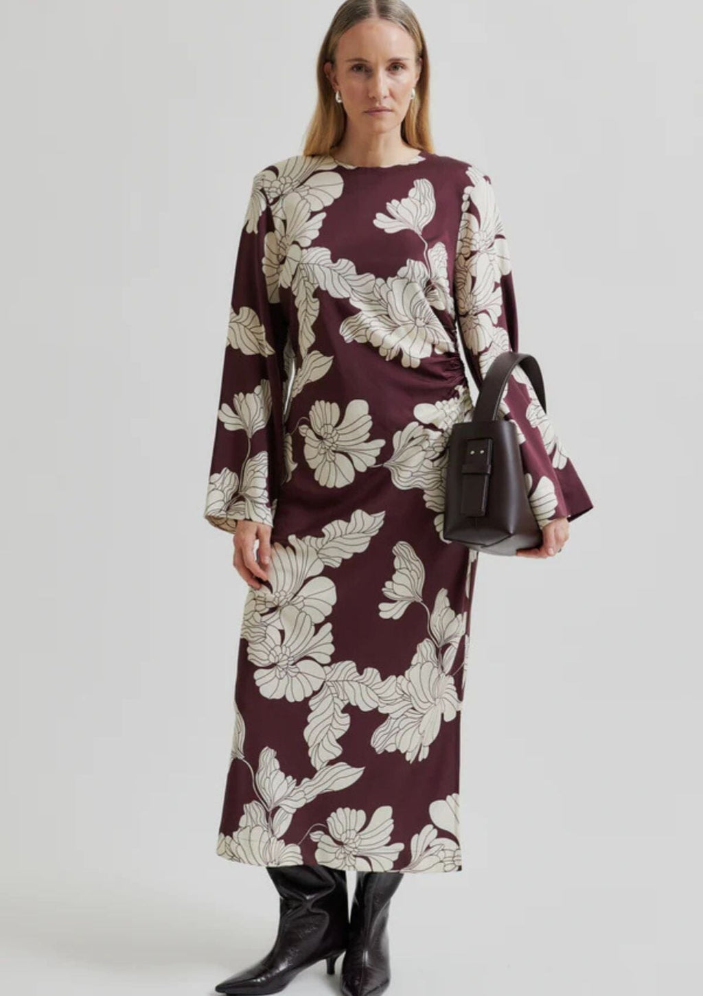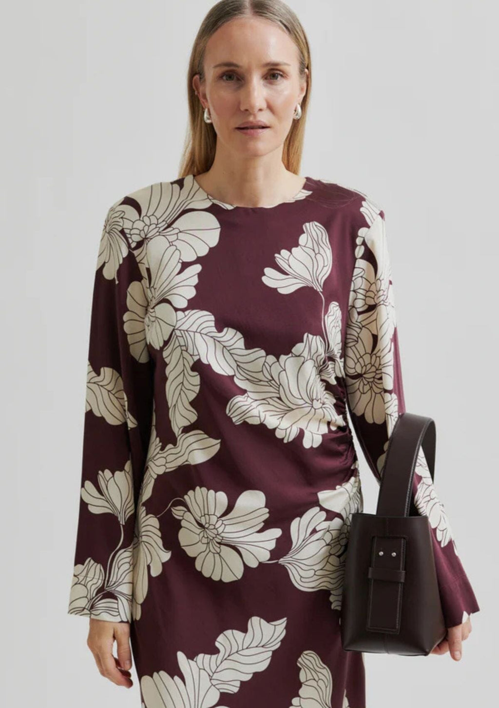 Second Female dress with floral print. The dress is made in a soft and drapy viscose blend with all-over floral print. Featuring a round neckline and concealed zip fastening at the back with long fabric pullers. Padded shoulders and long sleeves. Gathered seam at one side that creates flattering draped effect. Deep slit at one side. Slim fit.