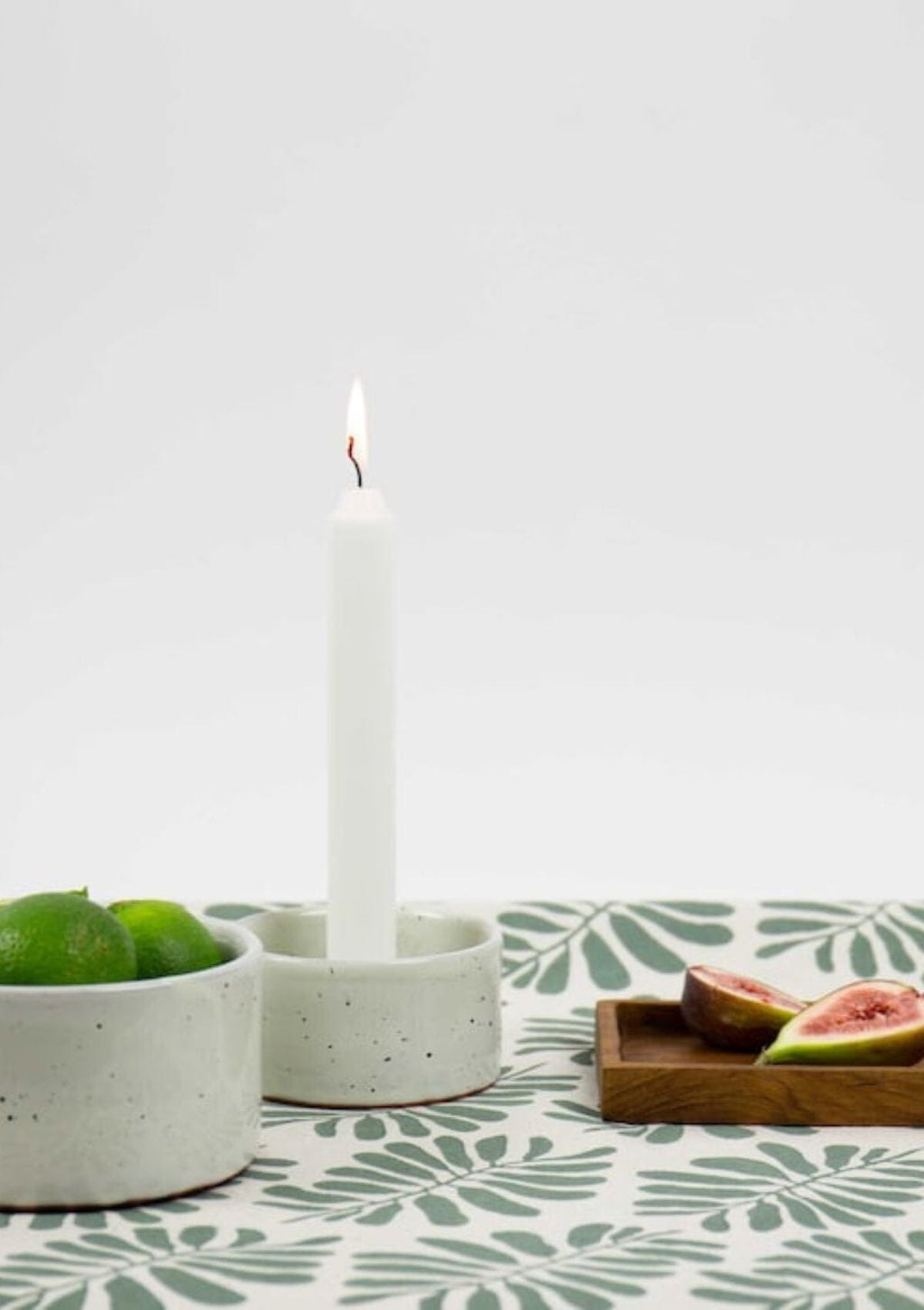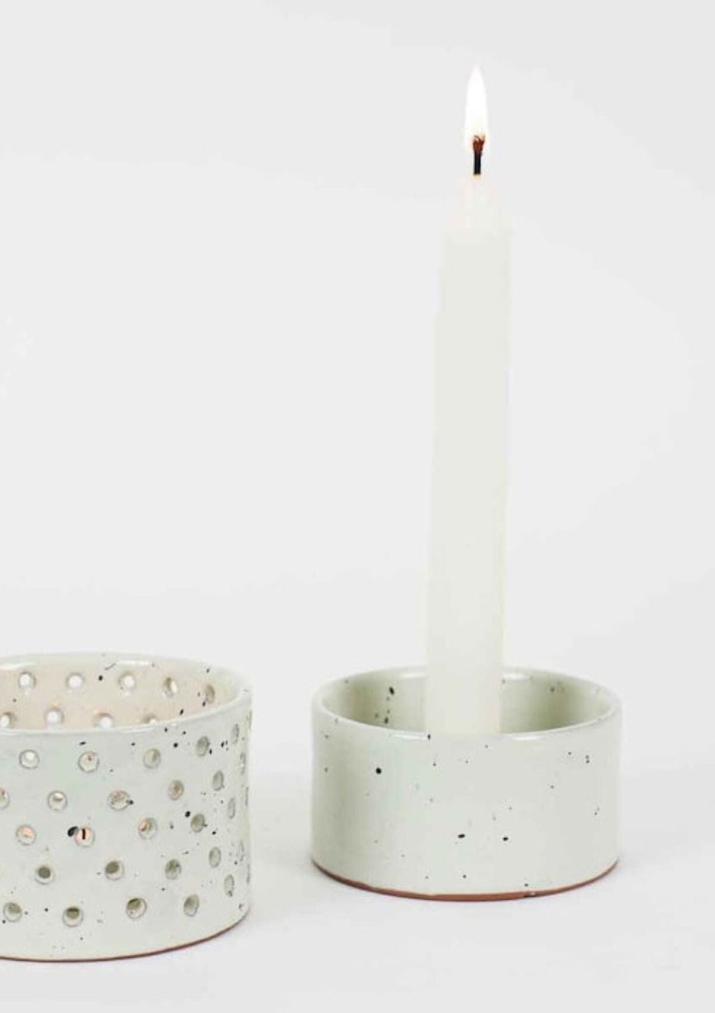 A small hand-thrown candle holder in a grey-white glossy glaze with small black irregular spots. The candle holder is dishwasher safe.
