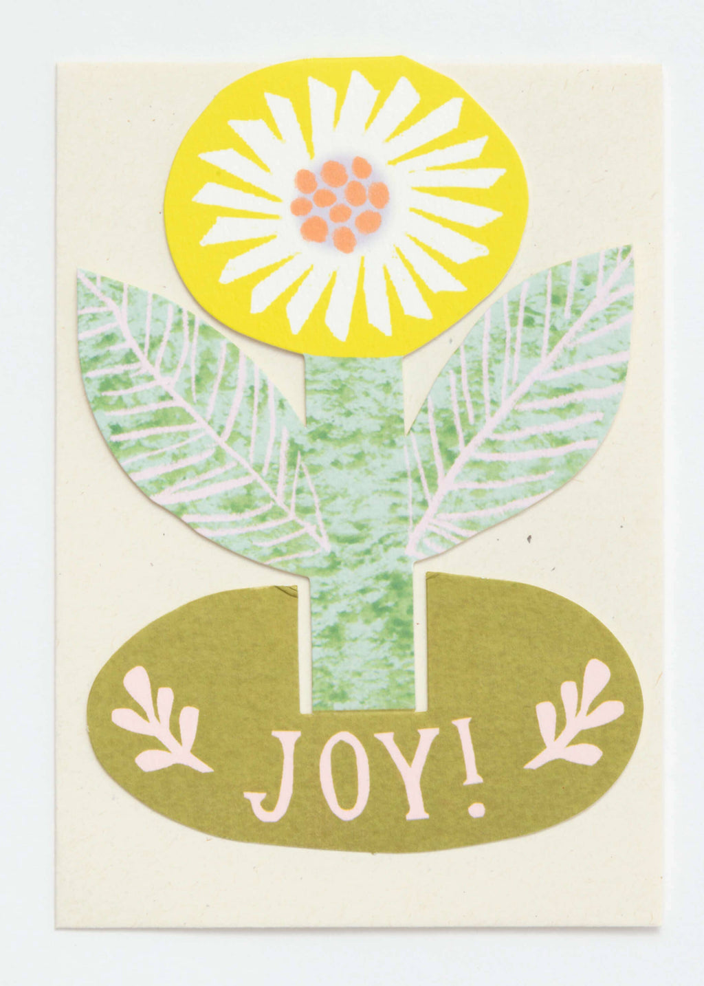 This beautiful yellow flower card folds out to become free standing with the message 'Joy!' on the base. Customers can send some happiness with this sustainable flower and brighten a loved ones home. This nature inspired stand-up card was designed in-house by Jo using collage techniques, giving it a lovely textured look. It would make an excellent Celebration or Easter card, or for any time your customers want to send some Joy! A beautiful card and decoration all in one! Printed on high quality 300gsm, eco-friendly card, fitting into a standard C6 recycled envelope. The inside is left blank for that all-important message. Presented and posted in plastic free packaging.
