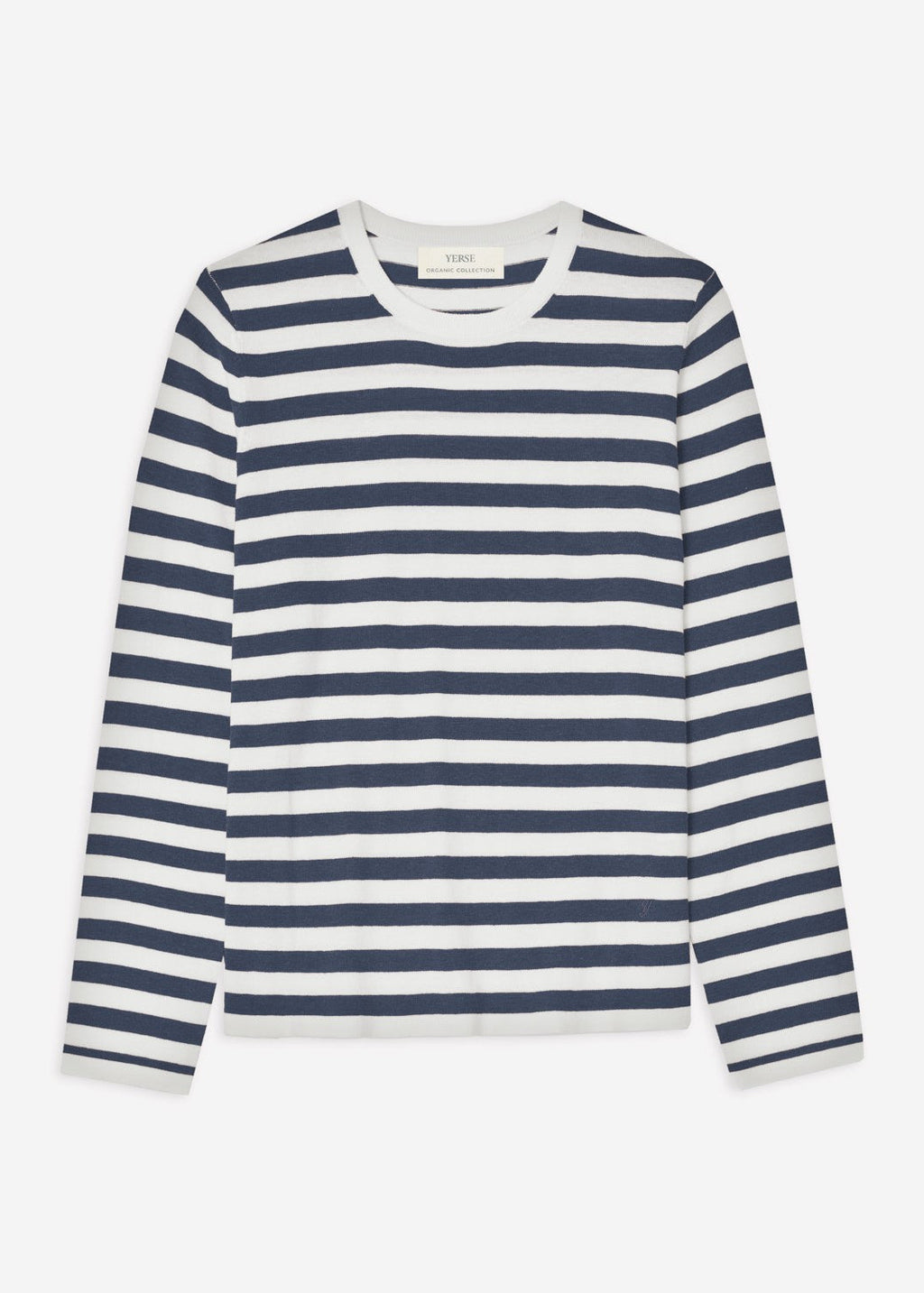 Navy-blue striped sweater. Organic cotton. Flat knit. Regular fit. Contrasting round neckline. Long sleeves. Fine gauge. Beautiful weight and feel, a perfect transition piece. Available in Navy stripe and Khaki stripe.